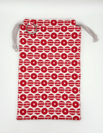 The drawstring bag is lined with a light grey solid fabric, and the drawstring is a pale grey cotton macrame rope.