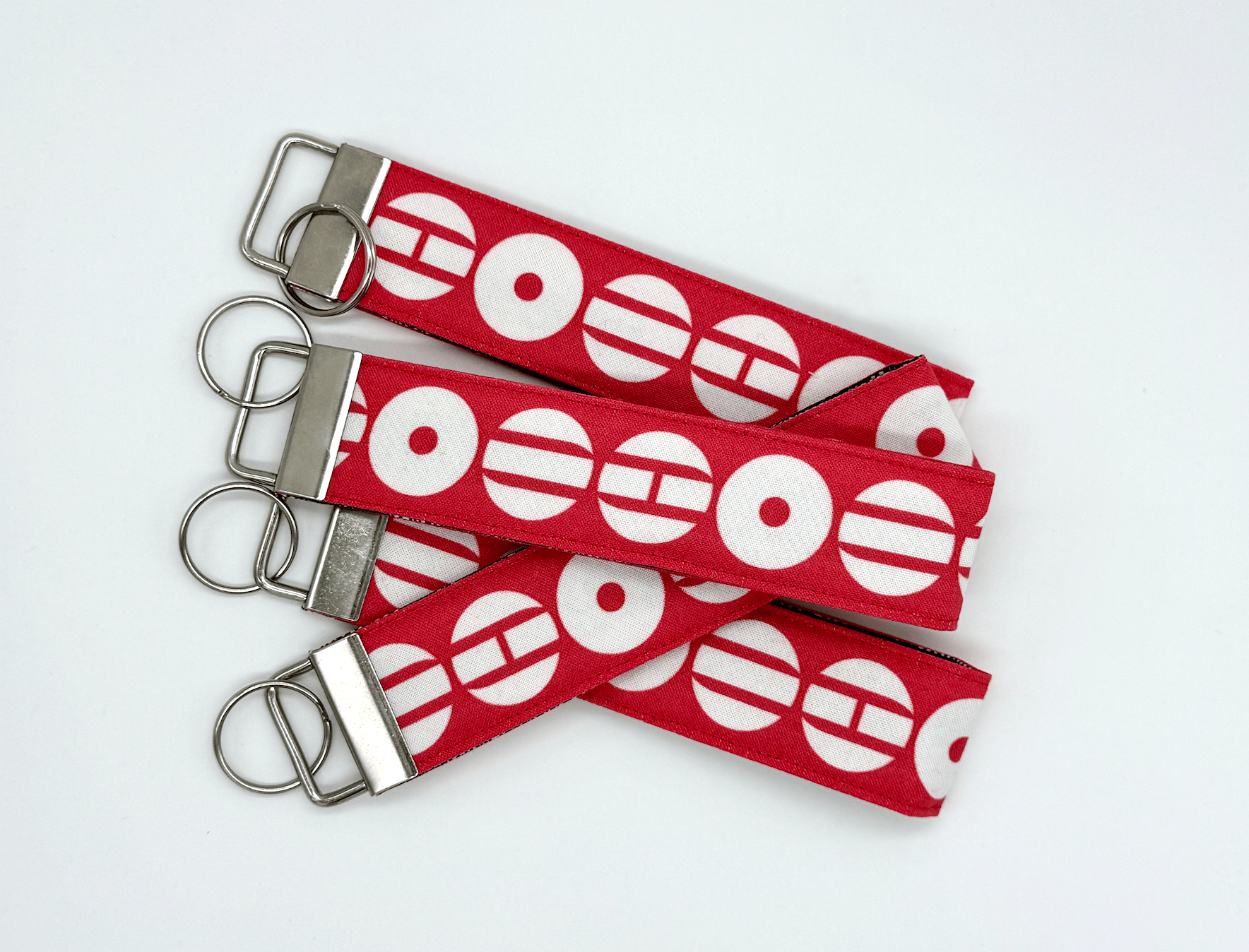 The hardware on the key fobs is nickel / silver . The key fobs have a fusible fleece in between the layers to give it a soft feel. The strap is 1.25" wide, and approximately 5" long folded (10" total), and the entire key fob is approximately 7" in length.
