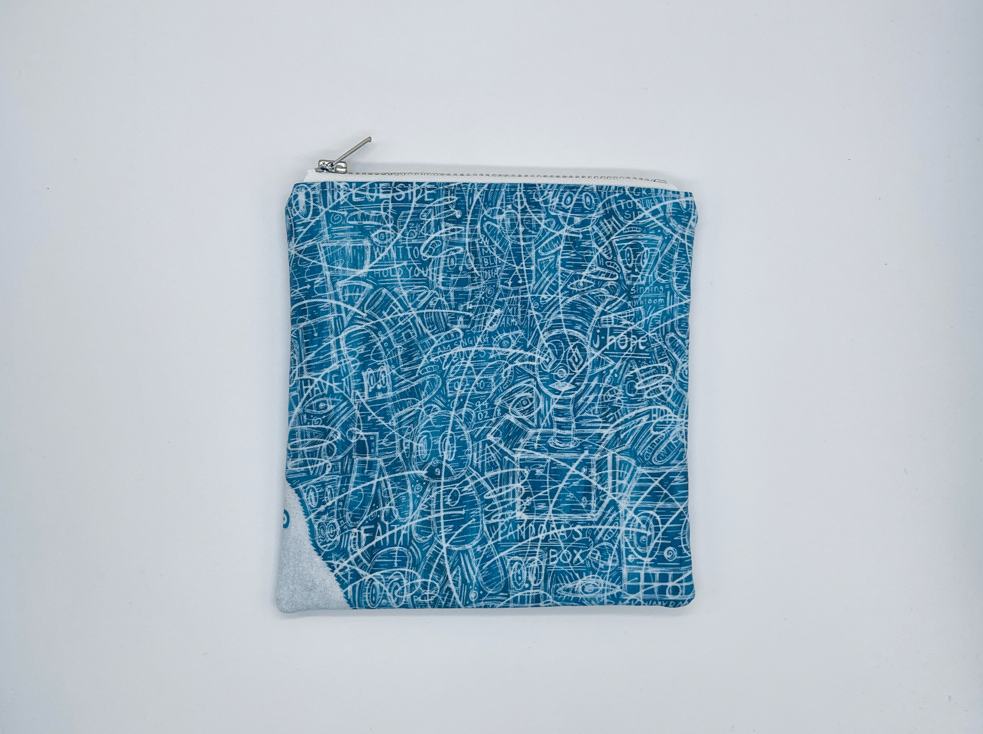 This zippy pouch features Blue Side artwork. The corners at the bottom of the bag are squared, and the bag is lined with a white with black asterisk fabric (2nd pic). The zipper is a nickel zipper.