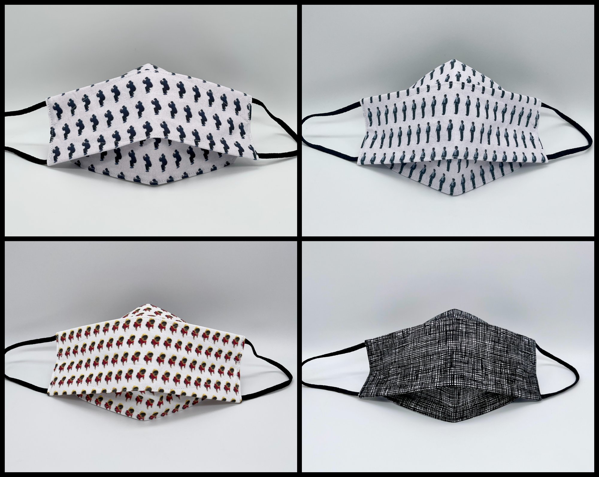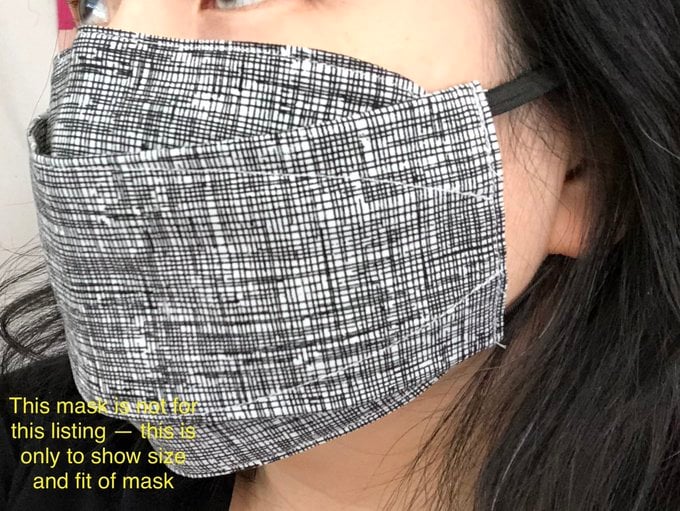 [The last picture is only to show how the face mask fits on the face and is not included in this listing. I do this because I will not wear the masks I make -- they are placed in a sealed bag after I photograph them.]